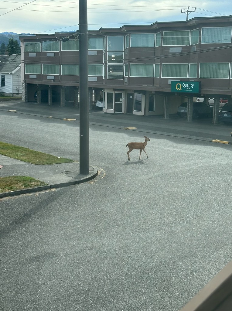 My stay at the Quality Inn in Port Angeles was very nice. There was a multitude of steps leading up a high hill to the motel, which was located in a quiet and charming neighborhood: I saw a little deer each morning and evening from my window, as well as a beautiful view of the surrounding mountains; church bells rang out gently from time to time; there was a Safeway grocery store a block down; and the wharf of Puget Sound was three minutes away!