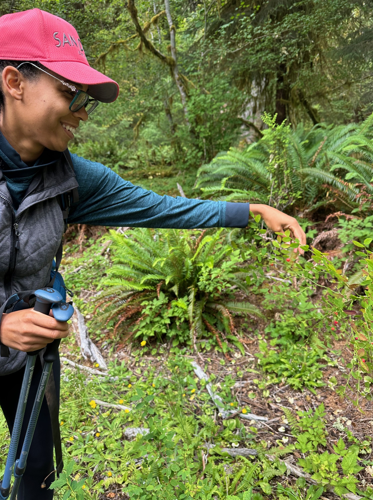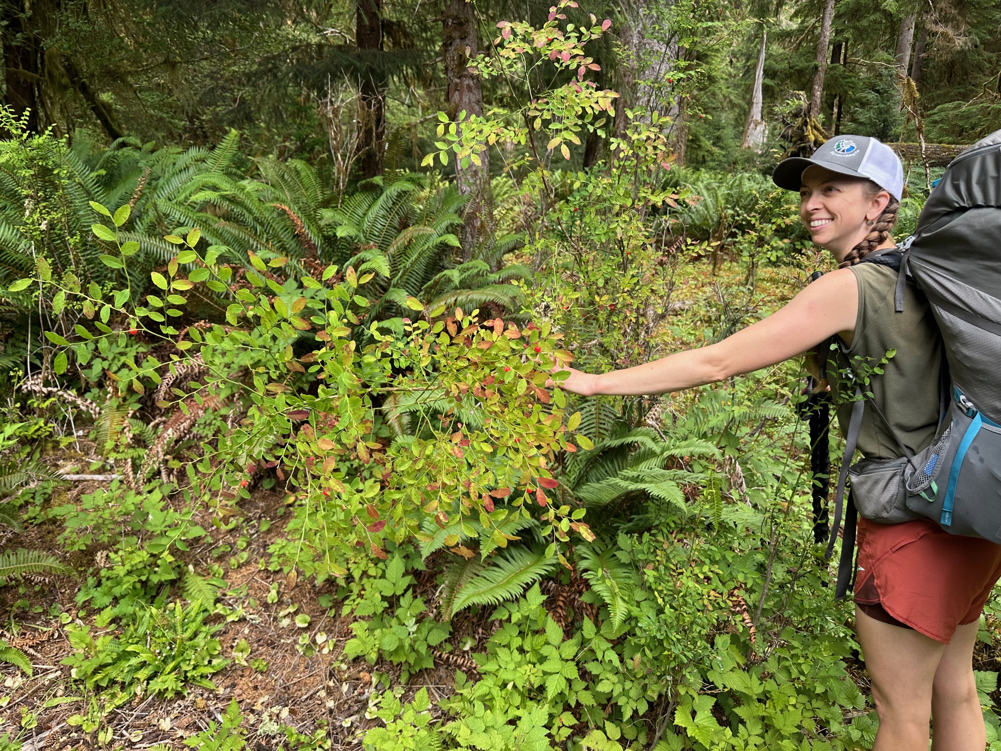 The Hoh Rainforest is a temperate rainforest, meaning it has a milder, cooler climate than the tropical rainforests which are the more prevalent rainforests worldwide. Incredible and wondrous are the huge moss covered trees; the other-worldly twining together of ferns and vines; and gigantic nurse logs (a nurse log being a fallen tree trunk that acts as a nursery for new plant growth). On our first day, we saw a large herd of Roosevelt elk including adults and calves, getting a drink across the river. The Hoh River, because it is fed by Mount Olympus’ Blue Glacier, is a unique milky grayish-blue color from a distance; and sparklingly clear up close. It is also, because of being fed by the glacier, numbingly, icily cold, as I found out on our two river crossings the first day! Our guides pointed out salmon berries and huckleberries, which I happily sampled along the way.