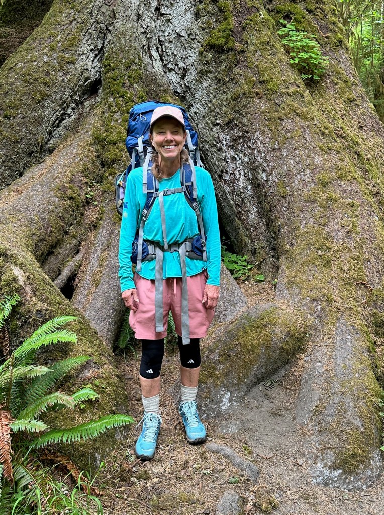 Our hiking group included six hikers of varying ages, and two guides from the Olympic Hiking Company. I had booked the hike well in advance, and our group had already become acquainted via a Zoom meeting, then had met up the evening before to pack backpacks, learn a few essential skills (like setting up the tent, and how to pack a backpack, for those of us who were new to backpacking) and make lunches. I can’t say enough great things about the Olympic Hiking Company. I went on this trip with the desire to learn all I could, and guides Casey and Amy were wonderful educators throughout the trip! The hike, considered “hard” by AllTrails; “difficult” by GAIA GPS, was yes, demanding, but definitively worth it!
