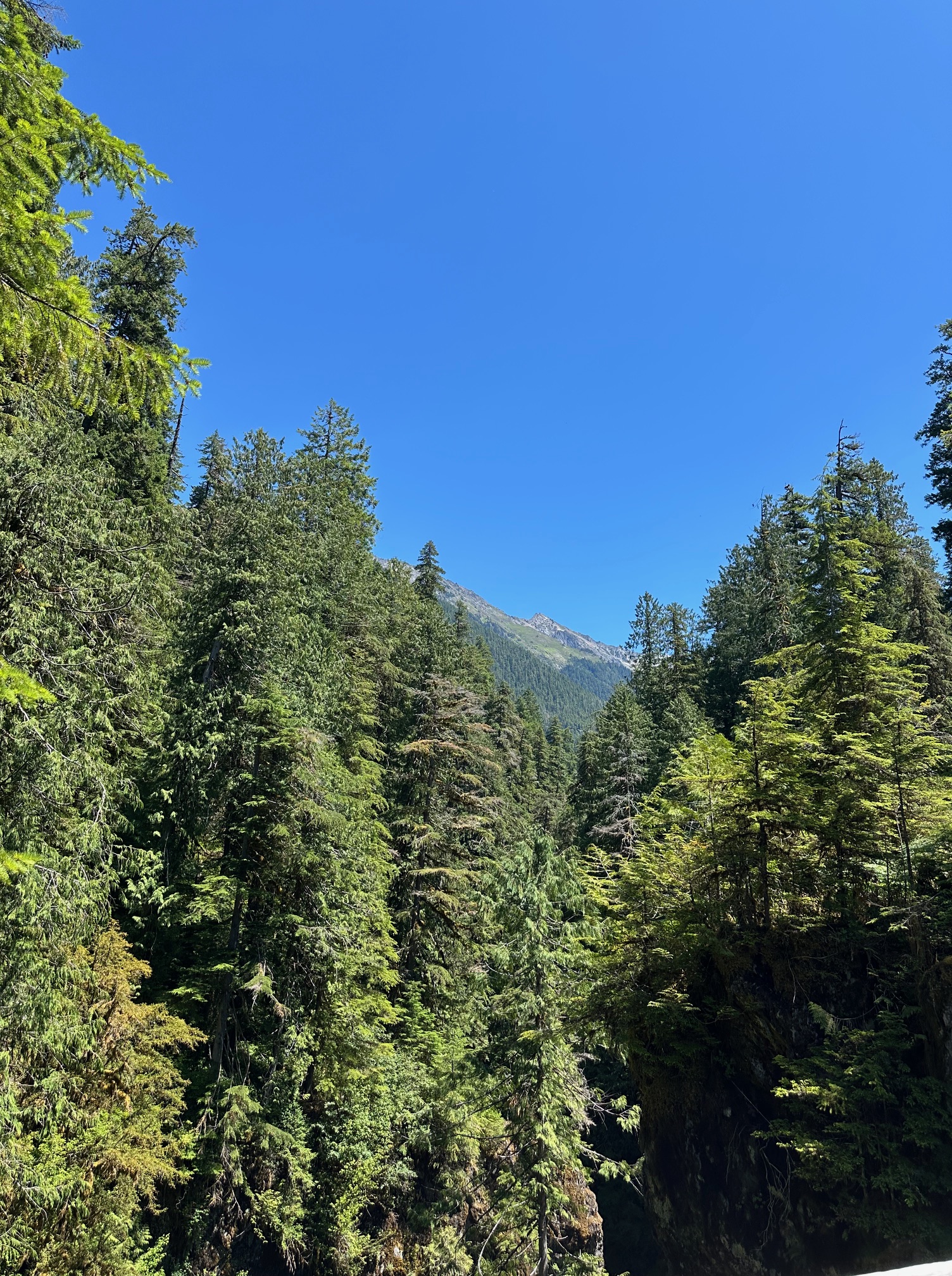 and our reward? the astonishing view from the High Hoh Bridge, which is over 100 feet above the river! Looking down in awe from the High Hoh Bride, you see the High Hoh Gorge—with the Hoh river rollicking down the river bed, surrounded by the Hoh’s forest life reaching up from far below to beyond the small humans looking at that narrow gorge in wonder from the bridge.